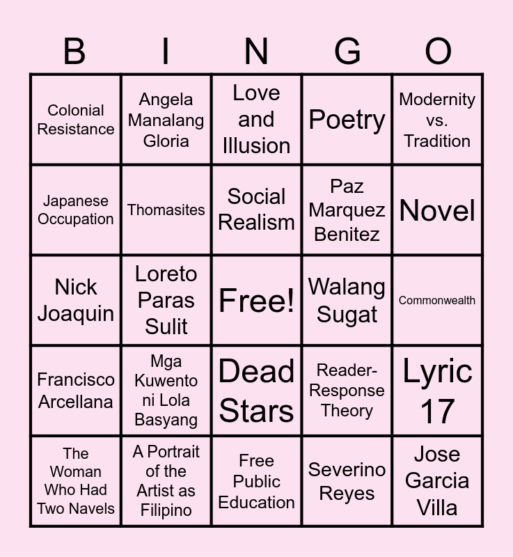 This bingo card has a free space and 34 words: Spanish-American War, Treaty of Paris, Filipino-American War, American Occupation, Commonwealth, Japanese Occupation, Thomasites, Free Public Education, Paz Marquez Benitez, Jose Garcia Villa, Nick Joaquin, Angela Manalang Gloria, Severino Reyes, Bienvenido Santos, Francisco Arcellana, Loreto Paras Sulit, Dead Stars, Walang Sugat, Lyric 17, The Woman Who Had Two Navels, A Portrait of the Artist as Filipino, Short Story, Poetry, Novel, Zarzuela, Mga Kuwento ni Lola Basyang, Love and Illusion, National Identity, Modernity vs. Tradition, Colonial Resistance, Filipino Voice, Social Realism, Reader-Response Theory and Mimetic Theory.