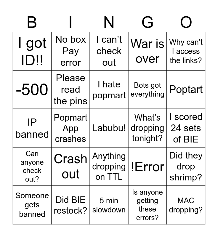 This bingo card has a free space and 24 words: Crash out, Did BIE restock?, I hate popmart, Someone gets banned, Why can’t I access the links?, I got ID!!, -500, No box Pay error, What’s dropping tonight?, Anything dropping on TTL, Bots got everything, IP banned, !Error, Did they drop shrimp?, Please read the pins, Is anyone getting these errors?, I scored 24 sets of BIE, I can’t check out, Poptart, Popmart App crashes, MAC dropping?, Can anyone check out?, War is over and 5 min slowdown.