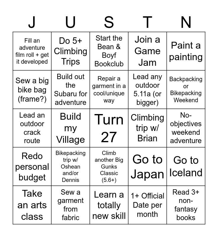 This bingo card has a free space and 24 words: Bikepacking trip w/ Oshean and/or Dennis, Sew a garment from fabric, Repair a garment in a cool/unique way, Take an arts class, Paint a painting, Fill an adventure film roll + get it developed, Sew a big bike bag (frame?), Do 5+ Climbing Trips, Climbing trip w/ Brian, Climb another Big Gunks Classic (5.6+), Lead any outdoor 5.11a (or bigger), Lead an outdoor crack route, Go to Japan, Go to Iceland, Build out the Subaru for adventure, 1+ Official Date per month, No-objectives weekend adventure, Start the Bean & Boyf Bookclub, Backpacking or Bikepacking Weekend, Build my Village, Read 3+ non-fantasy books, Redo personal budget, Join a Game Jam and Learn a totally new skill.