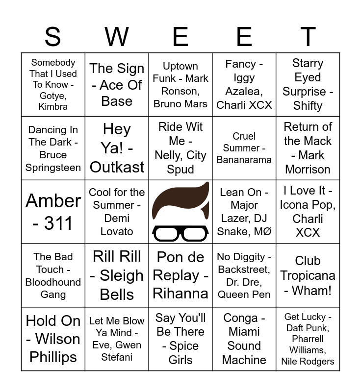 This bingo card has a free space and 40 words: Absolutely (Story Of A Girl) - Nine Days, Amber - 311, Crazy - Gnarls Barkley, Danger Mouse, Hey Ya! - Outkast, Let Me Blow Ya Mind - Eve, Gwen Stefani, Pon de Replay - Rihanna, Ride Wit Me - Nelly, City Spud, Right Thurr - Chingy, Starry Eyed Surprise - Shifty, The Bad Touch - Bloodhound Gang, Cool for the Summer - Demi Lovato, Fancy - Iggy Azalea, Charli XCX, Get Lucky - Daft Punk, Pharrell Williams, Nile Rodgers, I Love It - Icona Pop, Charli XCX, Lean On - Major Lazer, DJ Snake, MØ, Rill Rill - Sleigh Bells, Safe and Sound - Capital Cities, Somebody That I Used To Know - Gotye, Kimbra, Truth Hurts - Lizzo, Uptown Funk - Mark Ronson, Bruno Mars, Club Tropicana - Wham!, Conga - Miami Sound Machine, Cruel Summer - Bananarama, Dancing In The Dark - Bruce Springsteen, Don't You Want Me - The Human League, Good Thing - Fine Young Cannibals, Kiss - Prince, La Isla Bonita - Madonna, Straight Up - Paula Abdul, Working for the Weekend - Loverboy, All I Wanna Do - Sheryl Crow, Hold On - Wilson Phillips, MMMBop - Hanson, No Diggity - Backstreet, Dr. Dre, Queen Pen, Return of the Mack - Mark Morrison, Say You'll Be There - Spice Girls, Steal My Sunshine - LEN, The Impression That I Get - Mighty Mighty Bosstones, The Sign - Ace Of Base and Unbelievable - EMF.