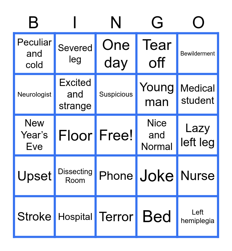 This bingo card has a free space and 24 words: Dissecting Room, Hospital, Suspicious, Stroke, Bewilderment, Peculiar and cold, Neurologist, Severed leg, Nice and Normal, Phone, Young man, New Year’s Eve, Joke, Nurse, Excited and strange, Bed, Lazy left leg, One day, Medical student, Floor, Left hemiplegia, Upset, Tear off and Terror.