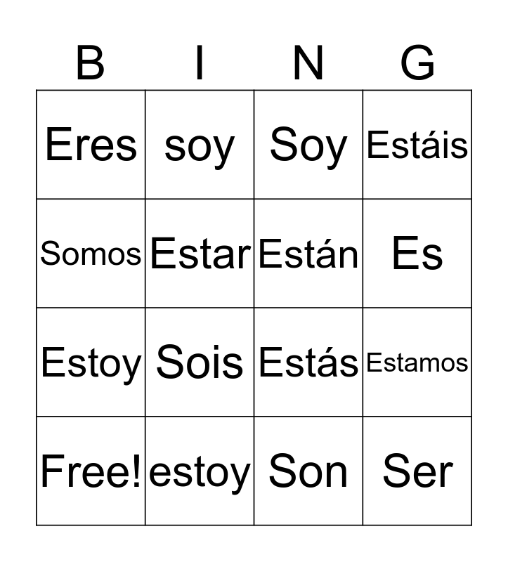 This bingo card has a free space and 15 words: Free!, Ser, Soy, Eres, Es, Somos, Sois, Son, Estar, Estoy, Estamos, Estáis, Están, soy and estoy.