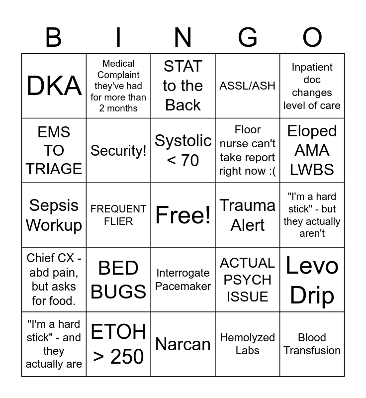 This bingo card has a free space and 24 words: BED BUGS, ETOH > 250, Systolic < 70, "I'm a hard stick" - and they actually are, Inpatient doc changes level of care, DKA, EMS TO TRIAGE, Medical Complaint they've had for more than 2 months, Trauma Alert, Interrogate Pacemaker, Floor nurse can't take report right now :(, Sepsis Workup, ACTUAL PSYCH ISSUE, Levo Drip, Security!, Hemolyzed Labs, "I'm a hard stick" - but they actually aren't, STAT to the Back, Eloped AMA LWBS, FREQUENT FLIER, Blood Transfusion, Chief CX - abd pain, but asks for food., ASSL/ASH and Narcan.