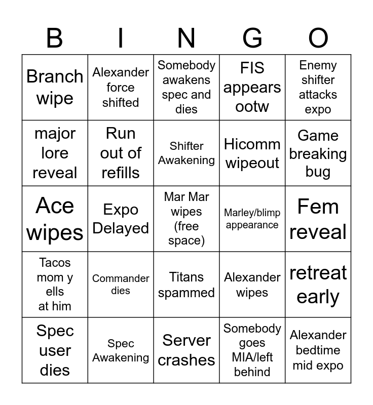 This bingo card has a free space and 24 words: Commander dies, Spec Awakening, Shifter Awakening, Spec user dies, Enemy shifter attacks expo, Branch wipe, major lore reveal, Alexander force shifted, Marley/blimp appearance, Titans spammed, Hicomm wipeout, Ace wipes, Alexander wipes, retreat early, Run out of refills, Somebody goes MIA/left behind, Fem reveal, Somebody awakens spec and dies, Game breaking bug, Expo Delayed, Alexander bedtime mid expo, Tacos mom yells at him, FIS appears ootw and Server crashes.