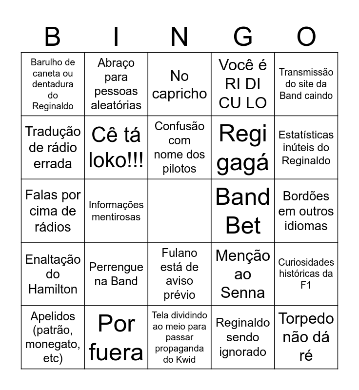 This bingo card has a free space and 24 words: Apelidos (patrão, monegato, etc), Perrengue na Band, Confusão com nome dos pilotos, Reginaldo sendo ignorado, Transmissão do site da Band caindo, Barulho de caneta ou dentadura do Reginaldo, Abraço para pessoas aleatórias, No capricho, Band Bet, Bordões em outros idiomas, Falas por cima de rádios, Cê tá loko!!!, Menção ao Senna, Curiosidades históricas da F1, Tradução de rádio errada, Por fuera, Tela dividindo ao meio para passar propaganda do Kwid, Você é RI DI CU LO, Estatísticas inúteis do Reginaldo, Enaltação do Hamilton, Informações mentirosas, Fulano está de aviso prévio, Regi gagá and Torpedo não dá ré.