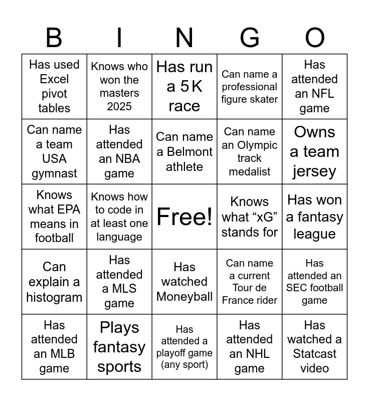 This bingo card has a free space and 29 words: Has attended an MLB game, Plays on a school sports team, Knows how to code in at least one language, Knows what sabermetrics is, Has used Excel pivot tables, Has run a 5 K race, Has attended an NBA game, Has attended a MLS game, Knows what “xG” stands for, Plays fantasy sports, Has won a fantasy league, Has watched a Statcast video, Has attended a playoff game (any sport), Has attended an NHL game, Owns a team jersey, Knows who Adam Schefter is, Has watched Moneyball, Can explain a histogram, Has attended an NFL game, Knows what EPA means in football, Can name a current Tour de France rider, Can name a current Wimbledon player, Can name an Olympic track medalist, Can name a team USA gymnast, Can name a professional figure skater, Knows who won the masters 2025, Has attended an SEC football game, Can name a Belmont athlete and Can name what team Caitlin Clark plays for.