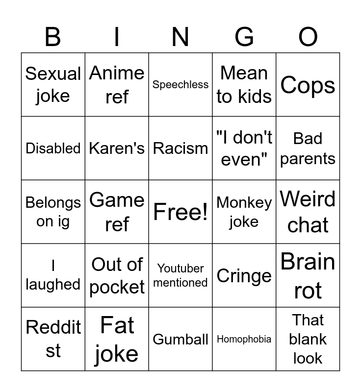 This bingo card has a free space and 24 words: Reddit st, Out of pocket, Racism, Homophobia, Cops, Sexual joke, Anime ref, Speechless, Monkey joke, Weird chat, Belongs on ig, Karen's, Cringe, Brain rot, Disabled, Fat joke, Gumball, Mean to kids, Bad parents, I laughed, Game ref, Youtuber mentioned, "I don't even" and That blank look.