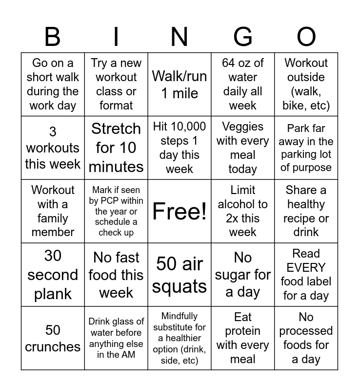 This bingo card has a free space and 24 words: No fast food this week, Drink glass of water before anything else in the AM, Hit 10,000 steps 1 day this week, 50 crunches, Workout outside (walk, bike, etc), Go on a short walk during the work day, 3 workouts this week, Try a new workout class or format, Limit alcohol to 2x this week, 50 air squats, Veggies with every meal today, Workout with a family member, No sugar for a day, Read EVERY food label for a day, Stretch for 10 minutes, Eat protein with every meal, Share a healthy recipe or drink, Walk/run 1 mile, Park far away in the parking lot of purpose, Mark if seen by PCP within the year or schedule a check up, No processed foods for a day, 30 second plank, 64 oz of water daily all week and Mindfully substitute for a healthier option (drink, side, etc).