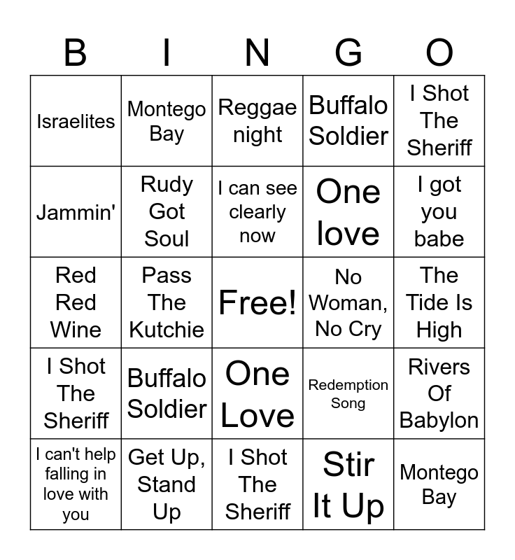 This bingo card has a free space and 24 words: Buffalo Soldier, Get Up, Stand Up, I can see clearly now, I can't help falling in love with you, I Shot The Sheriff, Israelites, Jammin', Montego Bay, No Woman, No Cry, One Love, One love, Red Red Wine, Redemption Song, Rivers Of Babylon, Rudy Got Soul, Stir It Up, The Tide Is High, Reggae night, I got you babe, Pass The Kutchie, Montego Bay, I Shot The Sheriff, Buffalo Soldier and I Shot The Sheriff.