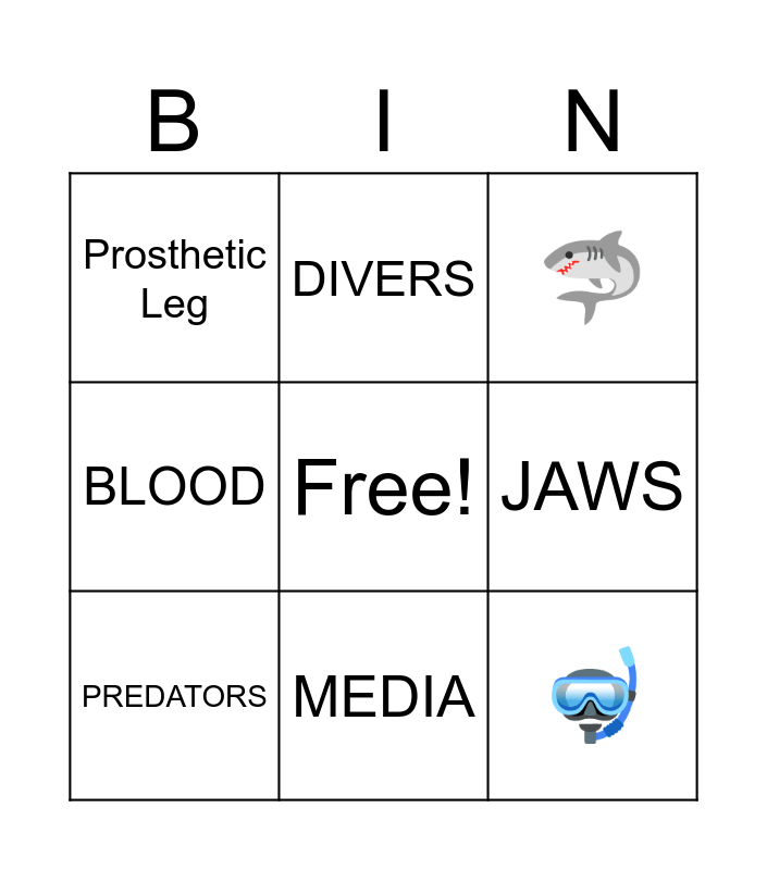 This bingo card has a free space and 8 words: JAWS, 🦈, DIVERS, PREDATORS, Prosthetic Leg, 🤿, BLOOD and MEDIA.