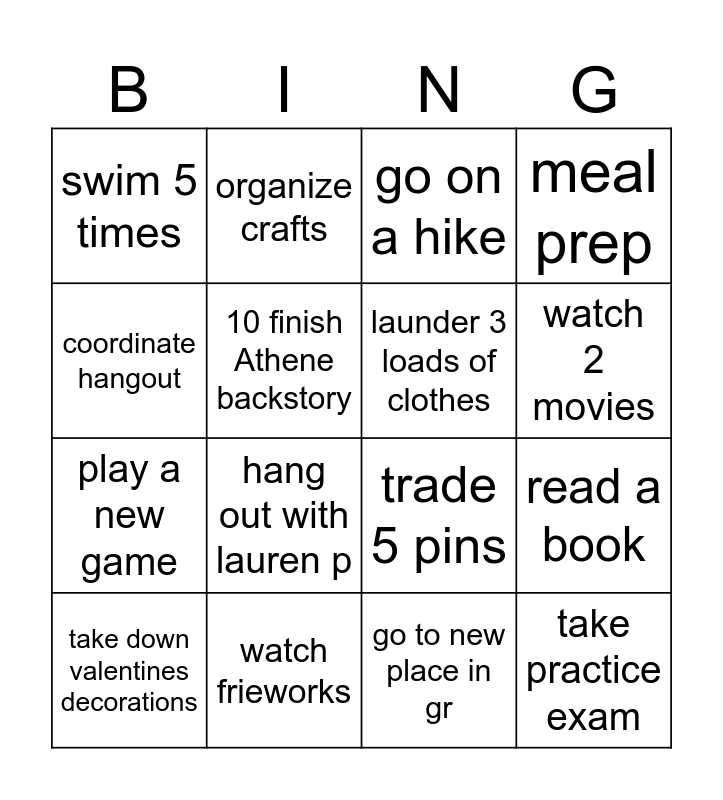 This bingo card has 16 words: watch frieworks, read a book, go on a hike, swim 5 times, play a new game, organize crafts, trade 5 pins, go to new place in gr, coordinate hangout, 10 finish Athene backstory, take down valentines decorations, meal prep, hang out with lauren p, watch 2 movies, launder 3 loads of clothes and take practice exam.