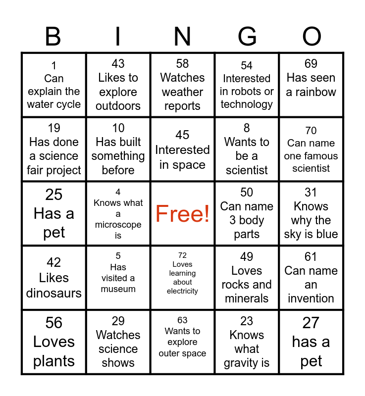 This bingo card has a free space and 24 words: 5 Has visited a museum, 29 Watches science shows, 45 Interested in space, 56 Loves plants, 69 Has seen a rainbow, 1 Can explain the water cycle, 19 Has done a science fair project, 43 Likes to explore outdoors, 50 Can name 3 body parts, 72 Loves learning about electricity, 8 Wants to be a scientist, 25 Has a pet, 49 Loves rocks and minerals, 61 Can name an invention, 10 Has built something before, 23 Knows what gravity is, 31 Knows why the sky is blue, 58 Watches weather reports, 70 Can name one famous scientist, 4 Knows what a microscope is, 27 has a pet, 42 Likes dinosaurs, 54 Interested in robots or technology and 63 Wants to explore outer space.