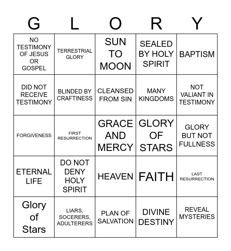 This bingo card has a free space and 24 words: Glory of Stars, DO NOT DENY HOLY SPIRIT, CLEANSED FROM SIN, DIVINE DESTINY, BAPTISM, NO TESTIMONY OF JESUS OR GOSPEL, TERRESTRIAL GLORY, SUN TO MOON, GLORY OF STARS, GLORY BUT NOT FULLNESS, FORGIVENESS, BLINDED BY CRAFTINESS, FAITH, LAST RESURRECTION, DID NOT RECEIVE TESTIMONY, LIARS, SOCERERS, ADULTERERS, PLAN OF SALVATION, SEALED BY HOLY SPIRIT, NOT VALIANT IN TESTIMONY, ETERNAL LIFE, FIRST RESURRECTION, HEAVEN, MANY KINGDOMS and REVEAL MYSTERIES.