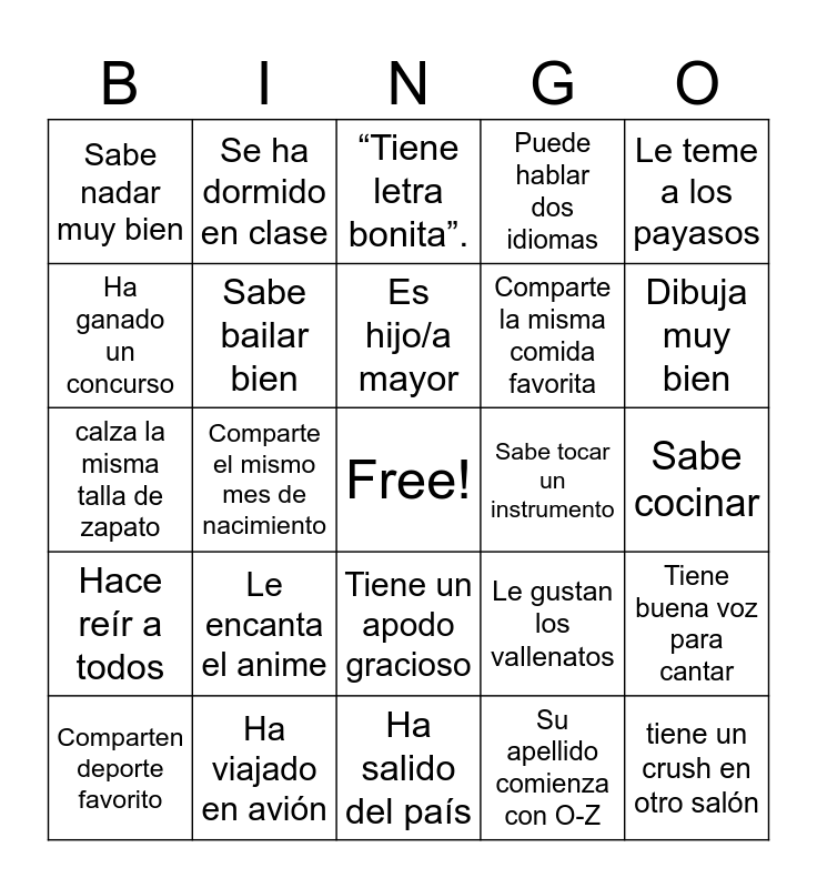 This bingo card has a free space and 24 words: Le encanta el anime, Ha viajado en avión, Es hijo/a mayor, Comparten deporte favorito, Le teme a los payasos, Sabe nadar muy bien, Ha ganado un concurso, Se ha dormido en clase, Sabe tocar un instrumento, Tiene un apodo gracioso, Comparte la misma comida favorita, calza la misma talla de zapato, Le gustan los vallenatos, Tiene buena voz para cantar, Sabe bailar bien, Su apellido comienza con O-Z, Sabe cocinar, “Tiene letra bonita”., Dibuja muy bien, Comparte el mismo mes de nacimiento, tiene un crush en otro salón, Hace reír a todos, Puede hablar dos idiomas and Ha salido del país.