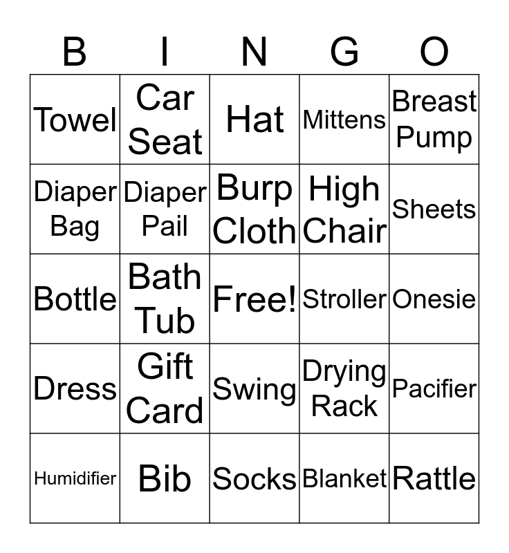 This bingo card has a free space and 24 words: Gift Card, Bib, Burp Cloth, Humidifier, Breast Pump, Towel, Diaper Bag, Car Seat, Stroller, Swing, High Chair, Bottle, Drying Rack, Pacifier, Diaper Pail, Blanket, Onesie, Hat, Sheets, Bath Tub, Rattle, Dress, Mittens and Socks.