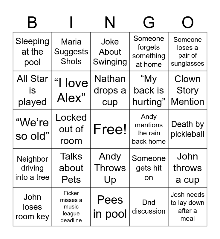 This bingo card has a free space and 29 words: John loses room key, Wedding ring gets lost, Locked out of room, Stickler Mention, Sleeping at the pool, Joke About Swinging, “I love Alex”, Talks about Pets, Andy mentions the rain back home, Ficker misses a music league deadline, Death by pickleball, Josh needs to lay down after a meal, Pees in pool, Dnd discussion, Clown Story Mention, Bri gets sunburnt, Andy Throws Up, Neighbor driving into a tree, Someone loses a pair of sunglasses, “We’re so old”, Someone gets hit on, Corey Madden mention, “My back is hurting”, All Star is played, Someone forgets something at home, Maria Suggests Shots, John throws a cup, Nathan drops a cup and Stephen works out while we’re hungover.