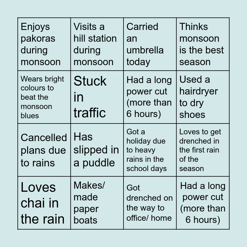 This bingo card has 17 words: Got drenched on the way to office/ home, Loves chai in the rain, Carried an umbrella today, Enjoys pakoras during monsoon, Has slipped in a puddle, Thinks monsoon is the best season, Loves to get drenched in the first rain of the season, Had a long power cut (more than 6 hours), Used a hairdryer to dry shoes, Stuck in traffic, Makes/ made paper boats, Got a holiday due to heavy rains in the school days, Wears bright colours to beat the monsoon blues, Visits a hill station during monsoon, Cancelled plans due to rains, Has a favourite monsoon song and Had a long power cut (more than 6 hours).