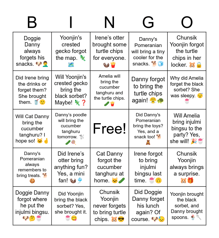 This bingo card has a free space and 30 words: Did Yoonjin bring the black sorbet? Yes, she brought it. ๐ง๐, Amelia forgot the turtle chips again. ๐ข๐ , Dannyโs poodle will bring the cucumber tanghuru tomorrow. ๐ฉ๐ฅ๐ญ, Did Irene bring the injulmi bingsu? No, she forgot it. ๐ง๐, Doggie Danny always forgets his snacks. ๐ถ๐คฆโโ๏ธ, Ireneโs otter brought some turtle chips for everyone. ๐ฆฆ๐, Will Yoonjin's crested gecko bring the black sorbet? Maybe! ๐ฆโ, Cat Danny forgot the cucumber tanghuru at home. ๐ฑ๐ฅ, Did Danny's Pomeranian bring the toys? Yes, and a snack too! ๐๐งธ, Chunsik Yoonjin never forgets to bring turtle chips. ๐น๐, Will Amelia bring injulmi bingsu to the party? Yes, she will! ๐๐ง, Yoonjin brought the black sorbet, and Danny brought spoons. ๐จ๐ฅ, Did Doggie Danny forget his lunch again? Of course. ๐ถ๐, Danny's poodle brings joy and turtle chips. ๐ฉโค๏ธ, Why did Amelia forget the black sorbet? She was sleepy. ๐ด๐ง, Yoonjin will bring cucumber tanghuru tomorrow. ๐ฅ๐ , Irene forgot to bring injulmi bingsu last time. ๐ง๐, Danny's Pomeranian always remembers to bring treats. ๐๐ช, Did Ireneโs otter bring anything fun? Yes, a mini fan! ๐ฆฆ๐, Chunsik Yoonjin forgot the turtle chips in her locker. ๐น๐, Will Cat Danny bring the cucumber tanghuru? I hope so! ๐ฑ๐ค, Amelia brings black sorbet every weekend. ๐จโฑ๏ธ, Yoonjin's crested gecko forgot the map. ๐ฆ๐บ๏ธ, Danny forgot to bring the turtle chips again! ๐ค๐ข, Did Irene bring the drinks or forget them? She brought them. ๐ฅค๐, Danny's Pomeranian will bring a tiny cooler for the snacks. ๐๐ง, Chunsik Yoonjin always brings a surprise. ๐น๐, Doggie Danny forgot where he put the injulmi bingsu. ๐ถ๐ค๐ง, Amelia will bring the cucumber tanghuru and the turtle chips. ๐ฅ๐ and Yoonjin brought everythingโฆ except the black sorbet! ๐ฌ๐จ.