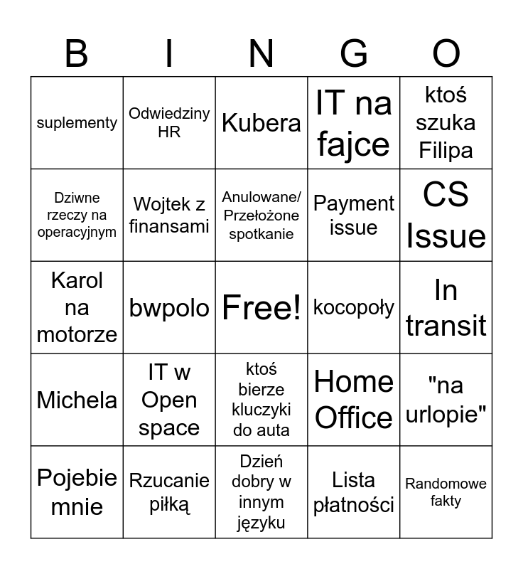 This bingo card has a free space and 24 words: Pojebie mnie, IT w Open space, Anulowane/ Przełożone spotkanie, Lista płatności, ktoś szuka Filipa, suplementy, Odwiedziny HR, Kubera, kocopoły, In transit, Karol na motorze, Wojtek z finansami, Home Office, "na urlopie", Dziwne rzeczy na operacyjnym, Rzucanie piłką, Dzień dobry w innym języku, IT na fajce, CS Issue, Michela, bwpolo, ktoś bierze kluczyki do auta, Payment issue and Randomowe fakty.