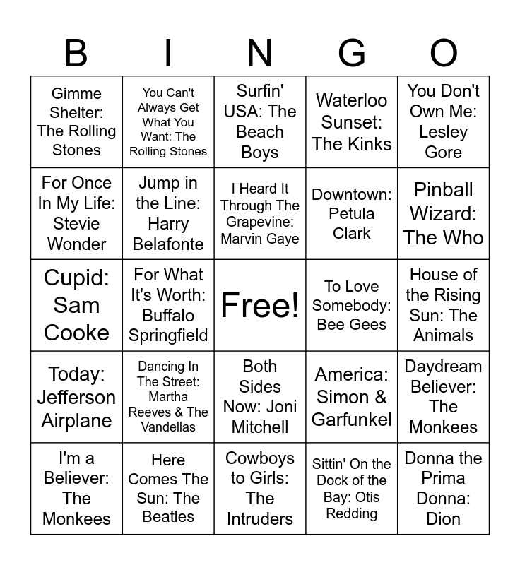 This bingo card has a free space and 50 words: Hippy Hippy Shake: The Swinging Blue Jeans, Donna the Prima Donna: Dion, Hush: Billy Joe Royal, Cowboys to Girls: The Intruders, Dancing In The Street: Martha Reeves & The Vandellas, It's In The Kiss: Betty Everett, You Can't Always Get What You Want: The Rolling Stones, These Boots Are Made for Walkin': Nancy Sinatra, For Once In My Life: Stevie Wonder, I Got You Babe: Sonny & Cher, Jump in the Line: Harry Belafonte, Waterloo Sunset: The Kinks, Daydream Believer: The Monkees, America: Simon & Garfunkel, Bad Moon Rising: Creedence Clearwater Revival, Magic Carpet Ride: Steppenwolf, I Heard It Through The Grapevine: Marvin Gaye, To Love Somebody: Bee Gees, Spooky: Dusty Springfield, You Don't Own Me: Lesley Gore, For What It's Worth: Buffalo Springfield, Sittin' On the Dock of the Bay: Otis Redding, Gimme Shelter: The Rolling Stones, Downtown: Petula Clark, My Way: Frank Sinatra, I'd Rather Go Blind: Etta James, Pinball Wizard: The Who, Stuck In The Middle With You: Stealers Wheel, Surfin' USA: The Beach Boys, Both Sides Now: Joni Mitchell, Oh, Pretty Woman: Roy Orbison, Can't Help Falling in Love: Elvis Presley, What A Wonderful World: Sam Cooke, Mr. Tambourine Man: Bob Dylan, Here Comes The Sun: The Beatles, Sugar, Sugar: The Archies, Like a Rolling Stone: Bob Dylan, Be My Baby: The Ronettes, Respect: Aretha Franklin, House of the Rising Sun: The Animals, Paint It, Black: The Rolling Stones, Hey Joe: Jimi Hendrix, Shout, Pts. 1 & 2: The Isley Brothers, Purple Haze: Jimi Hendrix, I'm a Believer: The Monkees, Cupid: Sam Cooke, Sunny Afternoon: The Kinks, Daydream: The Lovin' Spoonful, Today: Jefferson Airplane and Piece of My Heart: Erma Franklin.