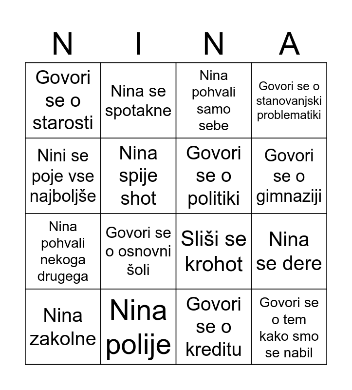 This bingo card has 16 words: Nina polije, Nina se dere, Nina pohvali samo sebe, Govori se o starosti, Nina pohvali nekoga drugega, Nina se spotakne, Sliši se krohot, Govori se o kreditu, Nini se poje vse najboljše, Nina spije shot, Nina zakolne, Govori se o stanovanjski problematiki, Govori se o osnovni šoli, Govori se o gimnaziji, Govori se o politiki and Govori se o tem kako smo se nabil.