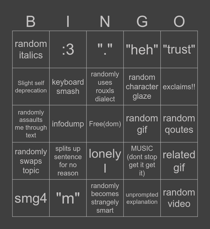 This bingo card has a free space and 29 words: "i think", "m", ".", apologizes for no reason, "trust", random italics, keyboard smash, randomly uses rouxls dialect, random gif, related gif, smg4, infodump, unprompted explanation, random video, randomly assaults me through text, deltarune, randomly becomes strangely smart, MUSIC (dont stop get it get it), exclaims!!, randomly swaps topic, splits up sentence for no reason, slapstick comedy, random character glaze, random qoutes, Slight self deprecation, :3, lonely I, "heh" and random crash out.