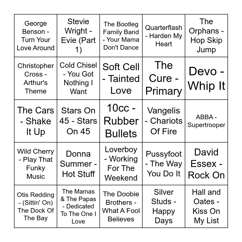 This bingo card has 35 words: Men At Work - Down Under, Lindsey Buckingham - Trouble, Shakin' Stevens - Oh Julie, Cold Chisel - You Got Nothing I Want, Loverboy - Working For The Weekend, Quarterflash - Harden My Heart, Christopher Cross - Arthur's Theme, Elton John - Blue Eyes, Soft Cell - Tainted Love, Foreigner - Waiting For A Girl, The Cars - Shake It Up, The Orphans - Hop Skip Jump, Pointer Sisters - Should I Do It, Earth Wind & Fire - Let's Groove, George Benson - Turn Your Love Around, Vangelis - Chariots Of Fire, Silver Studs - Happy Days, Stars On 45 - Stars On 45, Wild Cherry - Play That Funky Music, 10cc - Rubber Bullets, Pussyfoot - The Way You Do It, Otis Redding - (Sittin' On) The Dock Of The Bay, David Essex - Rock On, The Mamas & The Papas - Dedicated To The One I Love, The Bootleg Family Band - Your Mama Don't Dance, Devo - Whip It, Hall and Oates - Kiss On My List, INXS - The Loved One, The Cure - Primary, ABBA - Supertrooper, Village People - Can't Stop The Music, The Doobie Brothers - What A Fool Believes, Donna Summer - Hot Stuff, Stevie Wright - Evie (Part 1) and Derek And The Dominos - Layla.