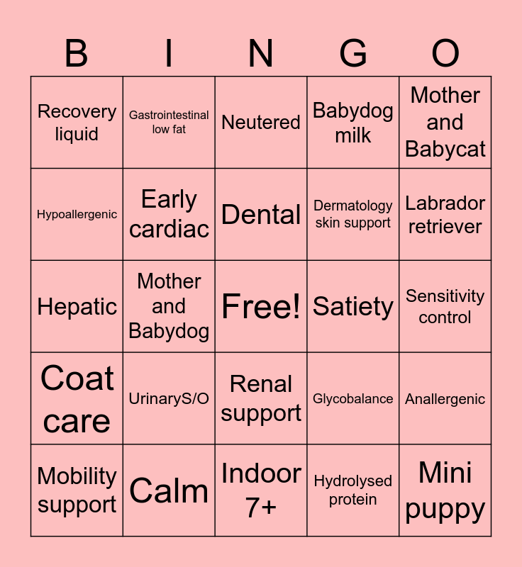 This bingo card has a free space and 24 words: UrinaryS/O, Calm, Dental, Mobility support, Mother and Babycat, Recovery liquid, Hypoallergenic, Gastrointestinal low fat, Satiety, Renal support, Dermatology skin support, Hepatic, Glycobalance, Anallergenic, Early cardiac, Hydrolysed protein, Sensitivity control, Neutered, Labrador retriever, Mother and Babydog, Mini puppy, Coat care, Babydog milk and Indoor 7+.