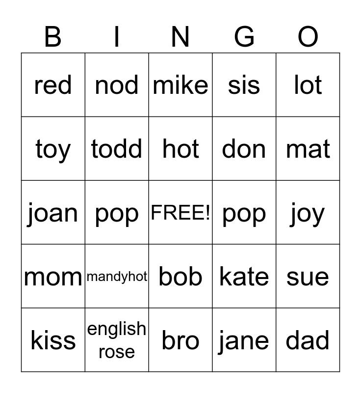 This bingo card has a free space and 24 words: mandyhot, english rose, hot, kiss, lot, red, toy, nod, pop, bob, don, joan, kate, sue, todd, jane, joy, mike, mat, pop, dad, mom, sis and bro.