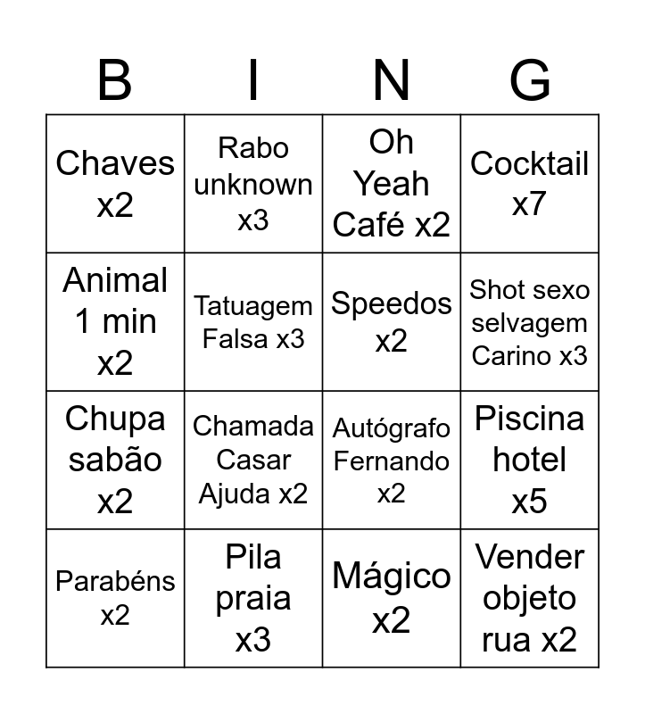 This bingo card has 16 words: Pila praia x3, Piscina hotel x5, Oh Yeah Café x2, Chaves x2, Chupa sabão x2, Rabo unknown x3, Autógrafo Fernando x2, Mágico x2, Animal 1 min x2, Tatuagem Falsa x3, Parabéns x2, Cocktail x7, Chamada Casar Ajuda x2, Shot sexo selvagem Carino x3, Speedos x2 and Vender objeto rua x2.