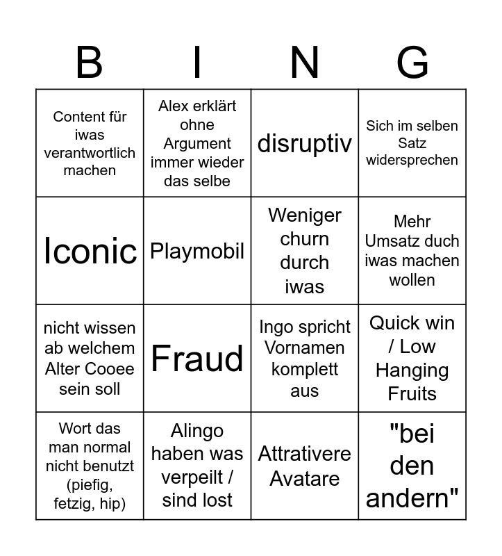 This bingo card has 16 words: Alingo haben was verpeilt / sind lost, Quick win / Low Hanging Fruits, disruptiv, Content für iwas verantwortlich machen, nicht wissen ab welchem Alter Cooee sein soll, Alex erklärt ohne Argument immer wieder das selbe, Ingo spricht Vornamen komplett aus, Attrativere Avatare, Iconic, Playmobil, Wort das man normal nicht benutzt (piefig, fetzig, hip), Sich im selben Satz widersprechen, Fraud, Mehr Umsatz duch iwas machen wollen, Weniger churn durch iwas and "bei den andern".