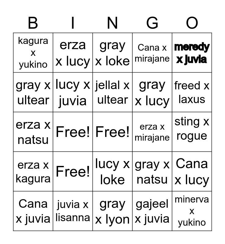 This bingo card has a free space and 27 words: gray x natsu, gray x erza, gray x lucy, gray x lyon, gray x ultear, gray x loke, erza x lucy, erza x kagura, erza x mirajane, Cana x lucy, erza x natsu, Cana x mirajane, Cana x juvia, juvia x lisanna, freed x laxus, Lyon x ultear, lucy x juvia, jellal x ultear, Free!, kagura x yukino, sting x rogue, gajeel x juvia, Free!, minerva x yukino, lucy x loke, meredy x juvia and natsu x lisanna.