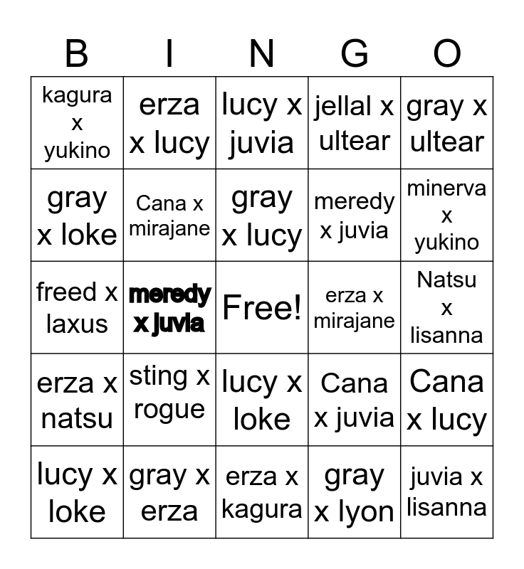 This bingo card has a free space and 27 words: gray x natsu, gray x erza, gray x lucy, gray x lyon, gray x ultear, gray x loke, erza x lucy, erza x kagura, erza x mirajane, Cana x lucy, erza x natsu, Cana x mirajane, Cana x juvia, juvia x lisanna, freed x laxus, Lyon x ultear, lucy x juvia, jellal x ultear, Natsu x lisanna, kagura x yukino, sting x rogue, lucy x loke, meredy x juvia, minerva x yukino, lucy x loke, meredy x juvia and natsu x lisanna.