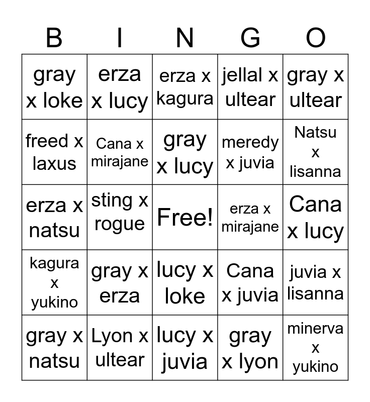 This bingo card has a free space and 24 words: gray x natsu, gray x erza, gray x lucy, gray x lyon, gray x ultear, gray x loke, erza x lucy, erza x kagura, erza x mirajane, Cana x lucy, erza x natsu, Cana x mirajane, Cana x juvia, juvia x lisanna, freed x laxus, Lyon x ultear, lucy x juvia, jellal x ultear, Natsu x lisanna, kagura x yukino, sting x rogue, lucy x loke, meredy x juvia and minerva x yukino.