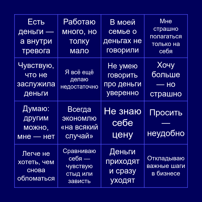This bingo card has 16 words: Сравниваю себя — чувствую стыд или зависть, Просить — неудобно, В моей семье о деньгах не говорили, Есть деньги — а внутри тревога, Думаю: другим можно, мне — нет, Работаю много, но толку мало, Не знаю себе цену, Деньги приходят и сразу уходят, Чувствую, что не заслужила деньги, Я всё ещё делаю недостаточно, Легче не хотеть, чем снова обломаться, Мне страшно полагаться только на себя, Всегда экономлю «на всякий случай», Хочу больше — но страшно, Не умею говорить про деньги уверенно and Откладываю важные шаги в бизнесе.