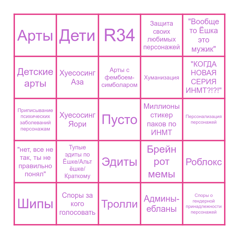 This bingo card has a free space and 24 words: Тупые эдиты по Ёшке/Альт ёшке/Краткому, Споры за кого голосовать, Арты с фембоем-симболаром, Шипы, "Вообще то Ёшка это мужик", Арты, Детские арты, Дети, Миллионы стикер паков по ИНМТ, Эдиты, Хуманизация, Приписывание психических заболеваний персонажам, Брейн рот мемы, Роблокс, Хуесосинг Аза, Админы-ебланы, Персонализация персонажей, R34, "КОГДА НОВАЯ СЕРИЯ ИНМТ?!?!", Хуесосинг Яори, Споры о гендерной принадлежности персонажей, "нет, все не так, ты не правильно понял", Защита своих любимых персонажей and Тролли.