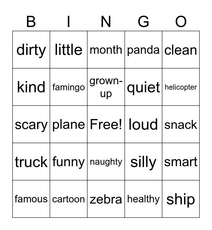 This bingo card has a free space and 24 words: funny, cartoon, grown-up, famous, clean, dirty, kind, little, loud, naughty, quiet, scary, silly, smart, famingo, healthy, snack, month, helicopter, plane, ship, truck, panda and zebra.