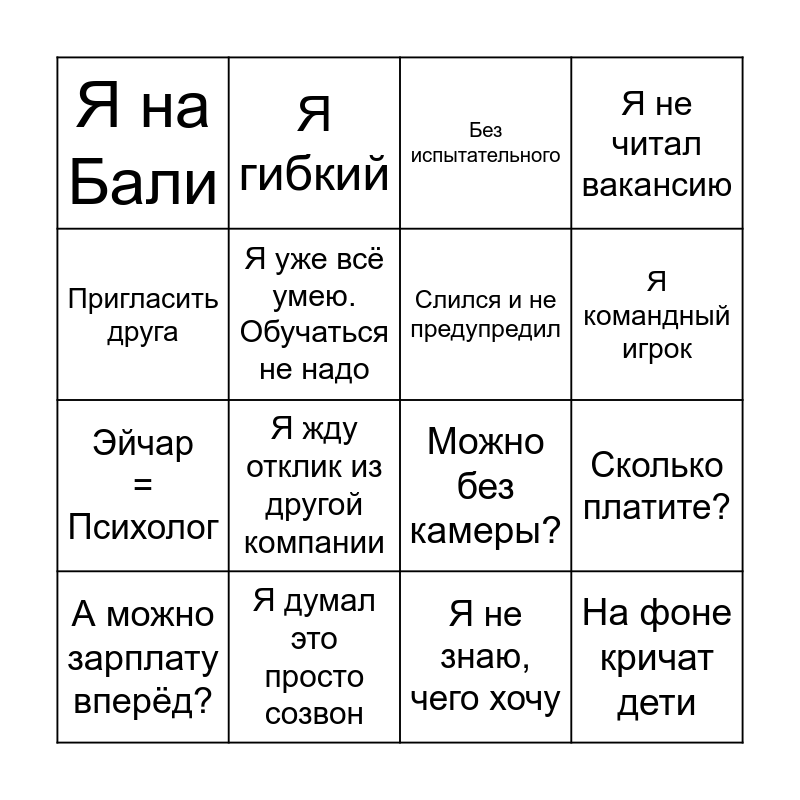 This bingo card has 16 words: Я думал это просто созвон, Сколько платите?, Без испытательного, Я на Бали, Эйчар = Психолог, Я гибкий, Можно без камеры?, Я не знаю, чего хочу, Пригласить друга, Я уже всё умею. Обучаться не надо, А можно зарплату вперёд?, Я не читал вакансию, Я жду отклик из другой компании, Я командный игрок, Слился и не предупредил and На фоне кричат дети.