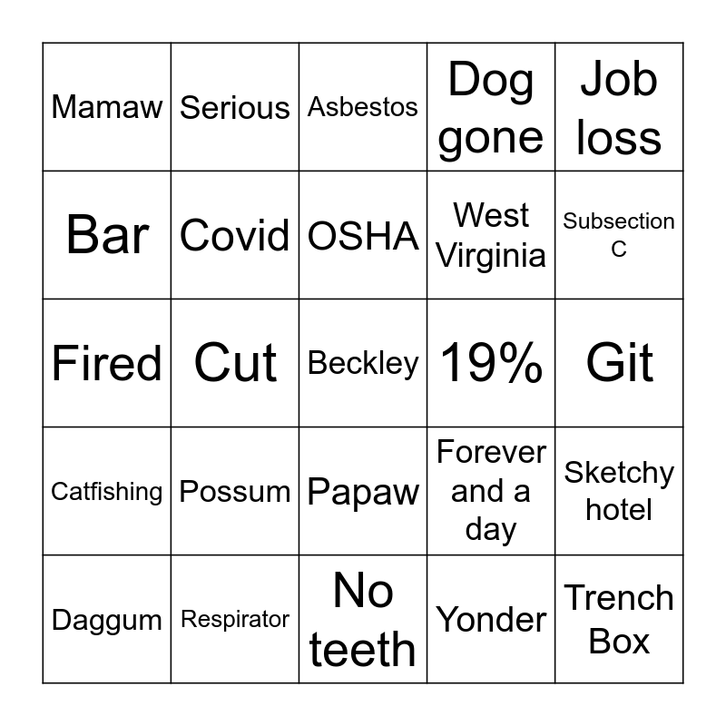 This bingo card has 45 words: Tragedy, Cut, Focus Four, Holler, Trench Box, Reportable, Serious, Most Cited, West Virginia, Sketchy hotel, Bar, Possum, OSHA, Forever and a day, Over, Steal stories, Proper Use, Asbestos, CFR, Subsection C, Mamaw, Ole dog, Beckley, Dog gone, Cat head biscuits, Daggum, Moonshine, Underground mines, Yonder, Git, PPE, Respirator, Papaw, Bologna, Fried, Catfishing, Cousin, No teeth, Drugs, Job loss, Fired, Covid, Acetylene, 19% and Silica.