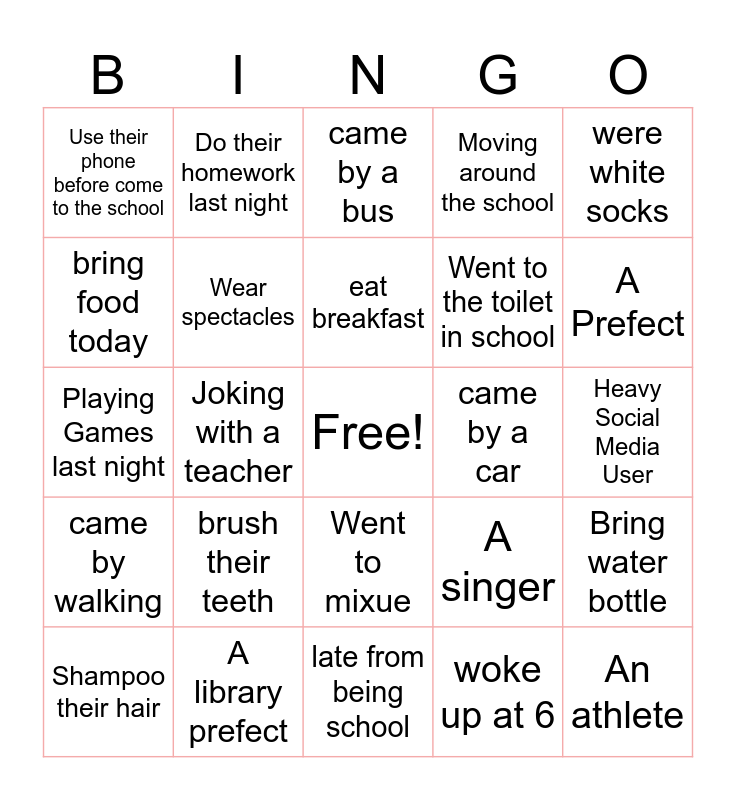 This bingo card has a free space and 24 words: brush their teeth, A library prefect, eat breakfast, Shampoo their hair, were white socks, Use their phone before come to the school, bring food today, Do their homework last night, came by a car, Went to mixue, Went to the toilet in school, Playing Games last night, A singer, Bring water bottle, Wear spectacles, woke up at 6, Heavy Social Media User, came by a bus, A Prefect, Joking with a teacher, An athlete, came by walking, Moving around the school and late from being school.