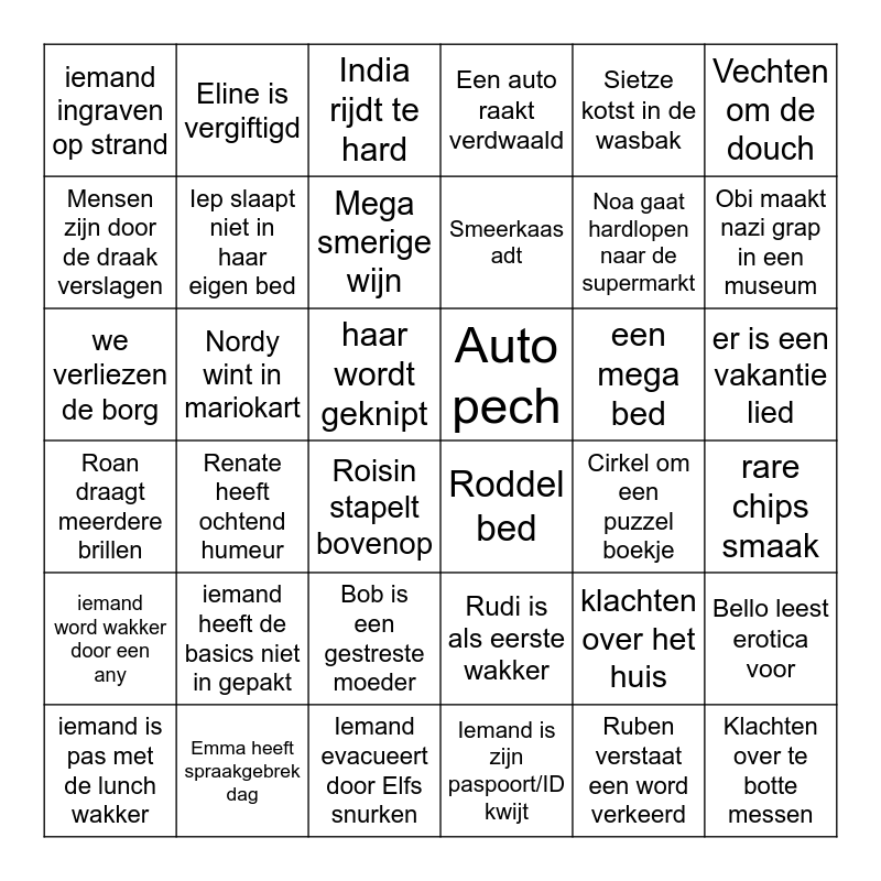 This bingo card has 36 words: Rudi is als eerste wakker, Bob is een gestreste moeder, Iemand is zijn paspoort/ID kwijt, Mensen zijn door de draak verslagen, Roan draagt meerdere brillen, Auto pech, Iep slaapt niet in haar eigen bed, Iemand evacueert door Elfs snurken, Sietze kotst in de wasbak, klachten over het huis, Obi maakt nazi grap in een museum, Een auto raakt verdwaald, Bello leest erotica voor, Nordy wint in mariokart, Smeerkaas adt, iemand ingraven op strand, iemand word wakker door een any, een mega bed, we verliezen de borg, India rijdt te hard, haar wordt geknipt, Renate heeft ochtend humeur, Roddel bed, Roisin stapelt bovenop, Cirkel om een puzzel boekje, Eline is vergiftigd, Noa gaat hardlopen naar de supermarkt, Emma heeft spraakgebrek dag, Mega smerige wijn, Vechten om de douch, Klachten over te botte messen, iemand is pas met de lunch wakker, rare chips smaak, er is een vakantie lied, iemand heeft de basics niet in gepakt and Ruben verstaat een word verkeerd.
