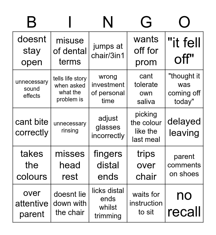 This bingo card has 41 words: excessive saliva, cant bite correctly, over active tongue, tenses lips, tells life story when asked what the problem is, doesnt lie down with the chair, fingers distal ends, wrong investment of personal time, OH poor, but is " brushing", "it fell off", takes the colours, unnecessary rinsing, wants off for prom, adjust glasses incorrectly, delayed leaving, picking the colour like the last meal, misses head rest, bangs head on light, doesnt stay open, " broke when brushing/eating soup etc", jumps at chair/3in1, parent comments on shoes, no recall, licks distal ends whilst trimming, cant tolerate own saliva, "comes from far", with this? points to mouthwash, waits for instruction to sit, sits in the +1 chair, "thought it was coming off today", parent tries to sit in nurses chair, "brace isnt broken, its just loose", misuse of dental terms, over attentive parent, dawdling from waiting room, trips over chair, unnecessary sound effects, ignores obvious tissue, "how long for next appointment", unusual chair stance, "how longs left" and "the lady downstairs".