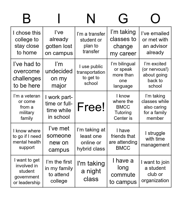 This bingo card has a free space and 30 words: I’m the first in my family to attend college, I’m returning to school after time off, I work part-time or full-time while in school, I’m attending college and raising a child, I chose this college to stay close to home, I’m a transfer student or plan to transfer, I’m undecided on my major, I’m taking at least one online or hybrid class, I know where the BMCC Tutoring Center is, I'm taking a night class, I’m taking classes while also caring for a family member, I want to join a student club or organization, I have a long commute to campus, I receive financial aid or scholarships, I’m excited (or nervous!) about going back to school, I have to balance school with other responsibilities, I have friends that are attending BMCC, I know where to go if I need mental health support, I’ve met someone new on campus, I’ve emailed or met with an advisor already, I’m a veteran or come from a military family, I plan to transfer to a 4-year college or university, I’ve already gotten lost on campus, I’m bilingual or speak more than one language, I’ve had to overcome challenges to be here, I’m taking classes to change my career, I struggle with time management, I want to get involved in student government or leadership, I use public transportation to get to school and I Struggle with Procrastination.