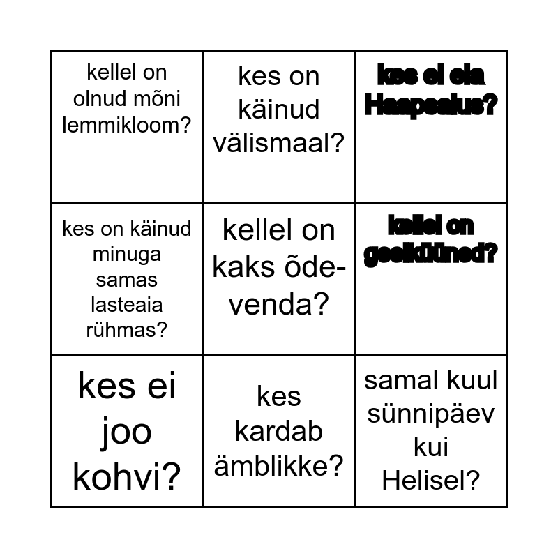 This bingo card has a free space and 8 words: kellel on geelküüned?, kes ei ela Haapsalus?, kes on käinud välismaal?, kes ei joo kohvi?, kellel on olnud mõni lemmikloom?, samal kuul sünnipäev kui Helisel?, kes on käinud minuga samas lasteaia rühmas? and kes kardab ämblikke?.