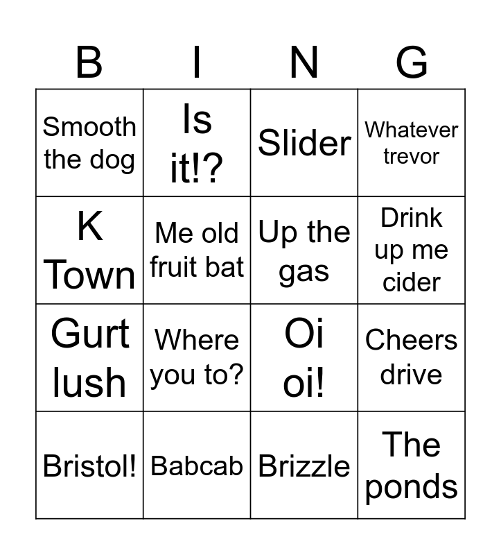 This bingo card has 16 words: Babcab, Cheers drive, Slider, Smooth the dog, Gurt lush, Is it!?, Oi oi!, Brizzle, K Town, Me old fruit bat, Bristol!, Whatever trevor, Where you to?, Drink up me cider, Up the gas and The ponds.