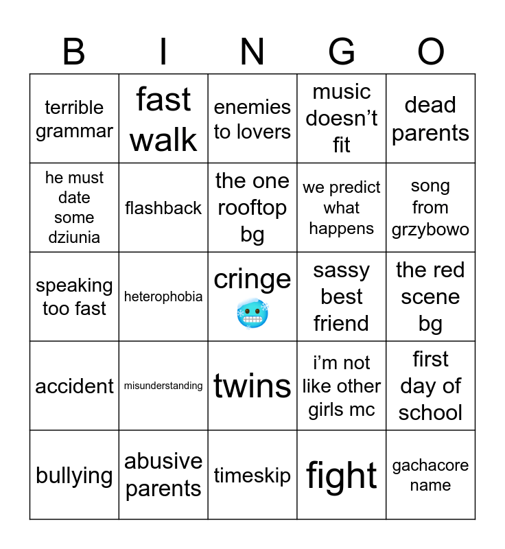 This bingo card has a free space and 29 words: bullying, edgy bad boy, heterophobia, she thought she ate, terrible grammar, enemies to lovers, flashback, misunderstanding, sassy best friend, abusive parents, the red scene bg, gachacore name, timeskip, fight, song from grzybowo, mean girl, twins, accident, dead parents, speaking too fast, i’m not like other girls mc, red flag, we predict what happens, he must date some dziunia, music doesn’t fit, fast walk, first day of school, the one rooftop bg and never mentioned again.