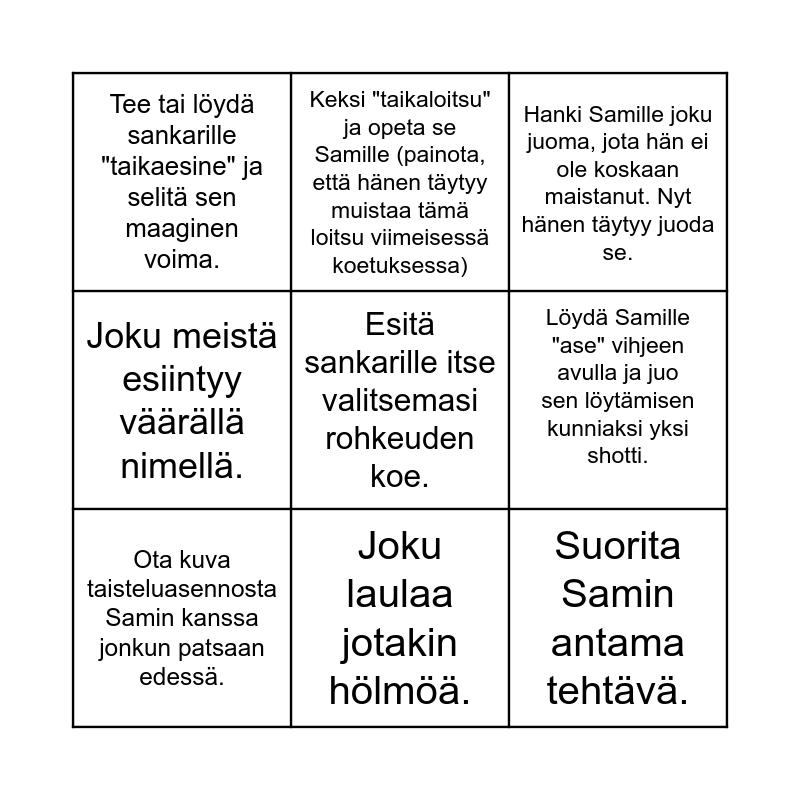 This bingo card has a free space and 8 words: Löydä Samille "ase" vihjeen avulla ja juo sen löytämisen kunniaksi yksi shotti., Hanki Samille joku juoma, jota hän ei ole koskaan maistanut. Nyt hänen täytyy juoda se., Keksi "taikaloitsu" ja opeta se Samille (painota, että hänen täytyy muistaa tämä loitsu viimeisessä koetuksessa), Ota kuva taisteluasennosta Samin kanssa jonkun patsaan edessä., Tee tai löydä sankarille "taikaesine" ja selitä sen maaginen voima., Suorita Samin antama tehtävä., Joku meistä esiintyy väärällä nimellä. and Joku laulaa jotakin hölmöä..