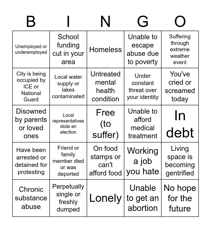 This bingo card has a free space and 24 words: Friend or family member died or was deported, Perpetually single or freshly dumped, Untreated mental health condition, Chronic substance abuse, Suffering through extreme weather event, Unemployed or underemployed, City is being occupied by ICE or National Guard, School funding cut in your area, Unable to afford medical treatment, On food stamps or can't afford food, Under constant threat over your identity, Disowned by parents or loved ones, Working a job you hate, Living space is becoming gentrified, Local water supply or lakes contaminated, Unable to get an abortion, In debt, Homeless, You've cried or screamed today, Local representatives stole an election, No hope for the future, Have been arrested or detained for protesting, Unable to escape abuse due to poverty and Lonely.