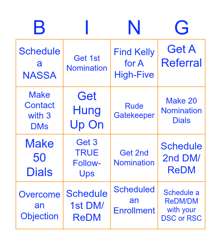 This bingo card has 16 words: Schedule 1st DM/ ReDM, Schedule 2nd DM/ ReDM, Find Kelly for A High-Five, Schedule a NASSA, Make 50 Dials, Get 1st Nomination, Get 2nd Nomination, Scheduled an Enrollment, Make Contact with 3 DMs, Get Hung Up On, Overcome an Objection, Get A Referral, Get 3 TRUE Follow-Ups, Make 20 Nomination Dials, Rude Gatekeeper and Schedule a ReDM/DM with your DSC or RSC.