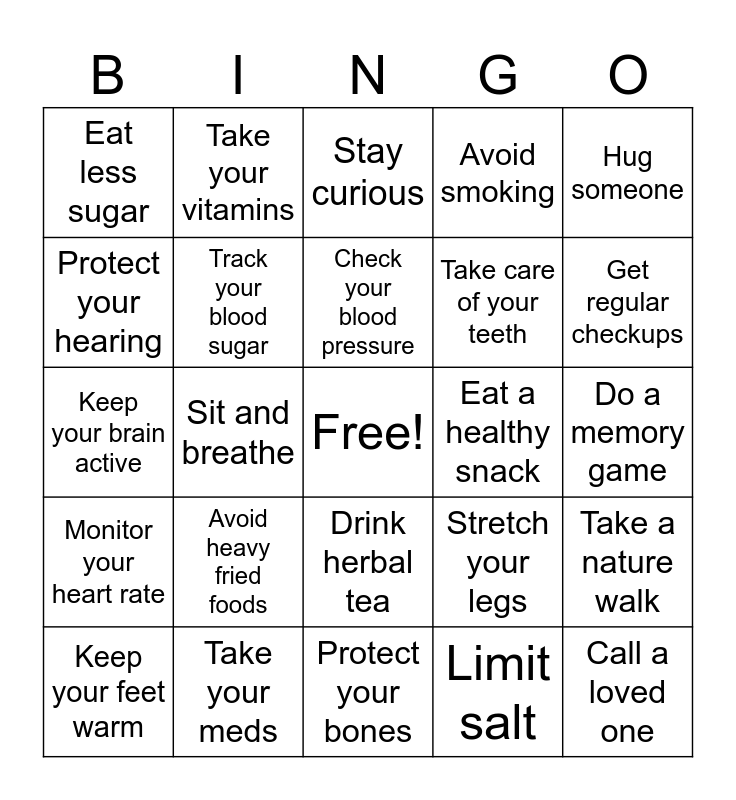This bingo card has a free space and 95 words: Drink more water, Walk every day, Limit salt, Get enough sleep, Eat more fiber, Breathe deeply, Laugh often, Take your meds, Stretch your body, Wash your hands, Eat fruits & veggies, Sit with good posture, Smile at someone, Check your blood pressure, Stay social, Eat less sugar, Get regular checkups, Protect your skin, Move your body, Relax your mind, Choose whole grains, Practice gratitude, Use sunscreen, Balance your meals, Avoid smoking, Protect your hearing, Stand up and stretch, Take care of your teeth, Use hand sanitizer, Strengthen your muscles, Avoid heavy fried foods, Eat leafy greens, Listen to music, Sit outside for sunlight, Keep your feet warm, Wear proper shoes, Protect your bones, Laugh with a friend, Keep your brain active, Read something uplifting, Take a nature walk, Sit and breathe, Drink herbal tea, Hug someone, Stretch your legs, Eat a healthy snack, Keep moving daily, Rest when needed, Try a new veggie, Listen to your body, Take vitamins, Do a puzzle, Write in a journal, Avoid too much TV, Keep hands clean, Laugh every day, Dance a little, Stay positive, Eat smaller portions, Try chair exercises, Track your blood sugar, Share a kind word, Keep a daily routine, Limit caffeine, Celebrate small wins, Use your walker, Take breaks, Talk to a friend, Stay curious, Take a deep breath, Drink water with meals, Eat breakfast, Call a loved one, Read for 10 minutes, Say something kind, Avoid added sugar, Keep your hands clean, Take a stretch break, Write a thank-you note, Take your vitamins, Sit in the sun (10 mins), Try something new, Move your ankles or feet, Stand up slowly, Do a memory game, Monitor your heart rate, Rest when tired, Ask for help, Use a night light, Eat something green, Listen to relaxing music, Do chair exercises, Plan tomorrow’s outfit, Open a window for fresh air and Count your blessings.